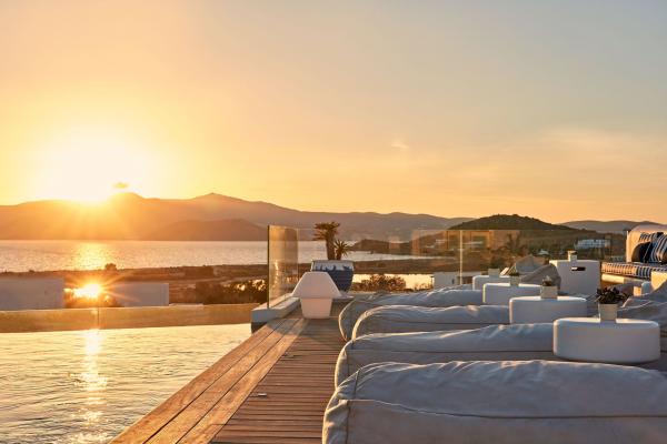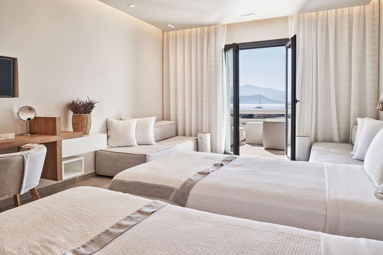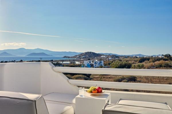 18 GRAPES is a unique -all suites- boutique hotel, epitomizing the essence of Cycladic leisure. Wisely located only 200 m. away from the breathtaking Agios Prokopios beach in Naxos, this new hospitality jewel is a hideaway of elegant luxury, offering to its guests upscale tailor-made services and features; all wrapped up in the excellence of high-end architecture. Boasting amazing sea-views, private pools and Jacuzzi, each one of the eighteen suites of the hotel is a fine sample of leading design and comfort. The hotel embodies the philosophy of Cycladic chic purity and calmness; an ideal setting to unwind and indulge in the carefree island vibes. From the cosmopolitan swimming pool area and the sophisticated sea-view roof garden with a pool bar, to the authentic breakfast area and breezy hotel gardens and terraces, the 18 GRAPES hotel is a place where the outgoing Naxian rhythms blend wonderfully with the serenity of privacy, delivering an outstanding holiday experience. The enfant gate of a well-known Naxian family of fine wine makers, 18 GRAPES Hotel is run by experienced tourism professionals. The result of this creative collaboration is reflected in the hotel's values: top quality services prior to arrival, advanced tailor-made guest facilities and bespoke concierge, the finest local products for an authentic in-house dining experience and access to the best of Naxos that only savvy insiders enjoy. Relaxed high living in an ambience created to inspire the guest's dreams and the services to make these dreams come true, that's the sunny mindset of this exceptional hotel. 37 m2, Max capacity: 4 (max adults:3), Sea View, Double & 1 or 2 sofa/single beds Features: Nespresso coffee maker, mini bar, Satellite 32'' TV, hairdryer, bathrobes, slippers, Korres bath amenities, scale, free WiFi