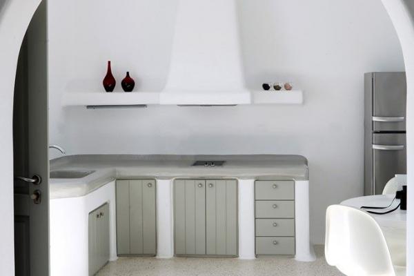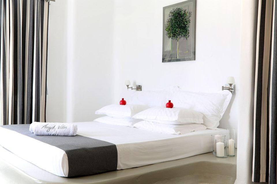 Angels Villas are situated in Angelohairetisti area in northern Paros, near the majestic town of Naoussa on the way to Kolymbithres. Be our guests and have an unforgettable holiday in one of our 6 detached villas surrounded by luscious greenery, palm trees and aromatic plants. You will be able to enjoy majestic sunsets and breath taking views of the Aegean sea. You can relax and unwind in our environmentally friendly pool or private hydromassage on your balcony and will feel at home in our comfortable and luxurious accommodation featuring traditional Cycladic architecture, mosaic floors, built-in beds and sofas. The complex is accessible only to our guests and their friends. The Honeymoon Sea View Villa has a large en-suite bedroom with a double built-in bed. There is also a fully equipped kitchen and a lounge area. In addition, there is a balcony with a sitting area, built-in hydromassage and deck chairs. From the balcony, you will be able to enjoy amazing view of Naoussa bay, adjacent beaches and the little island with Saint Kali's church.