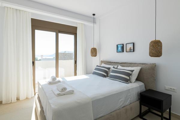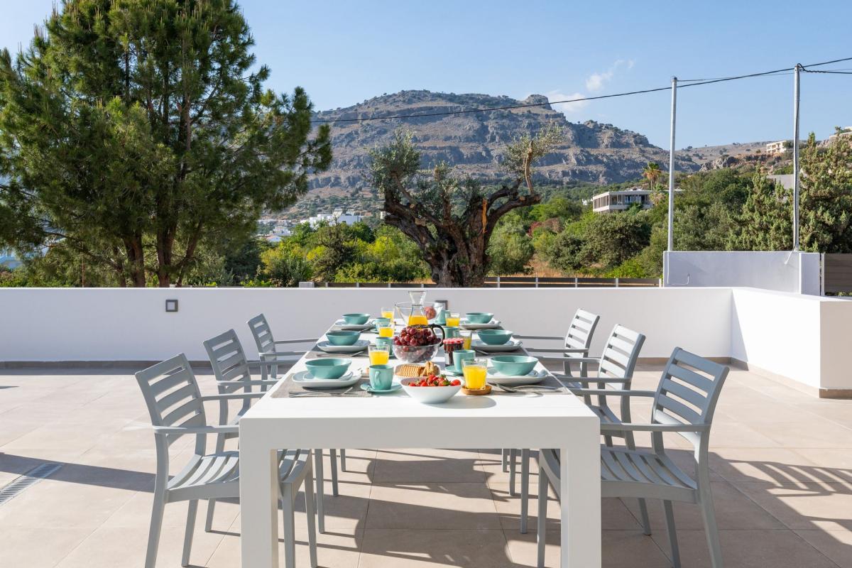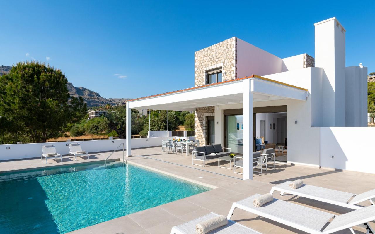 Villa Iris offers magnificent views of the blue Aegean Sea and the mountain from the private swimming pool in Rhodes